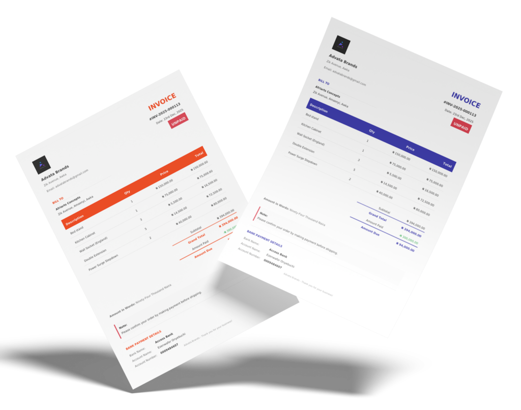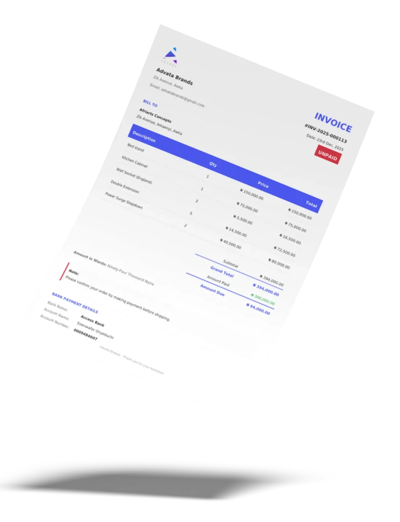 With Advata Invoice System, you can generate professional invoices online in seconds. Our invoice generator app makes it easy to create, manage, and send invoices to clients – perfect for freelancers, small businesses, and startups in Nigeria.