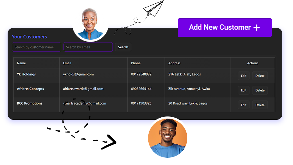 Keep all your clients organized with our customer management tools. Add, edit, or track client details, invoice history, and payments effortlessly. Simplify your workflow and save time managing your business finances.